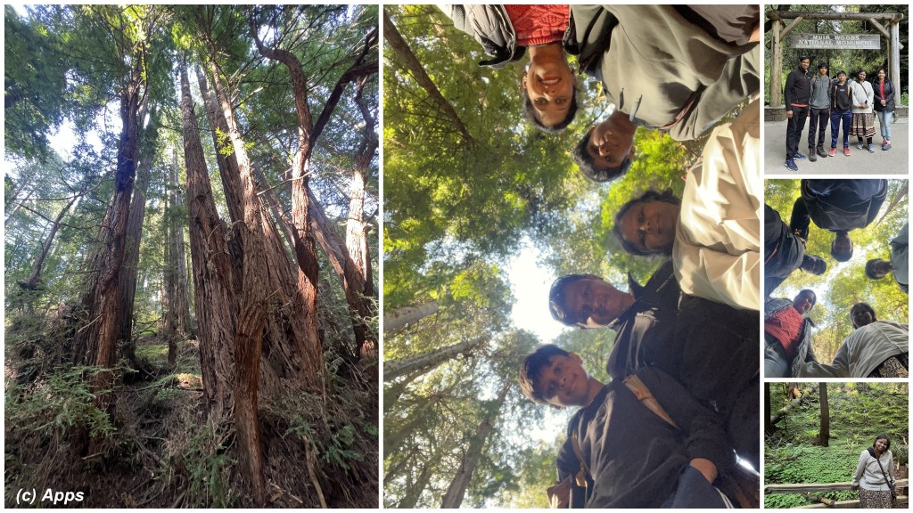 On the Sunday after my birthday, my brother and his family took me to Muir Woods National Monument. The whole are is filled with Redwood trees and we could hike among the giants. The Redwood trees are larger than Statue of Liberty with approx 379 ft. They form Family Circles where a single redwood tree would bring hundreds of young sprouts around this tree or a small seeds from a single tree grow into a large redwood tree. We hiked the Canopy View Trail which was supposed to be easiest of all, and I managed to complete everything with my trusty hiking stick at hand. 😛