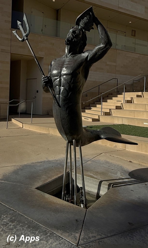 Apparently the teams of University of CA in San Deigo (UCSD) call themselves Trtitons. Appropriately they have a sculpture of Triton with the name The Triton Legend. Triton is known as the trumpeter of the deep according to Greek Mythology. He is the son of Poseidon, God of the Sea. Triton is represented as a Merman who carries a trident like his father and the special conch shell used to calm or raise seas when blown.