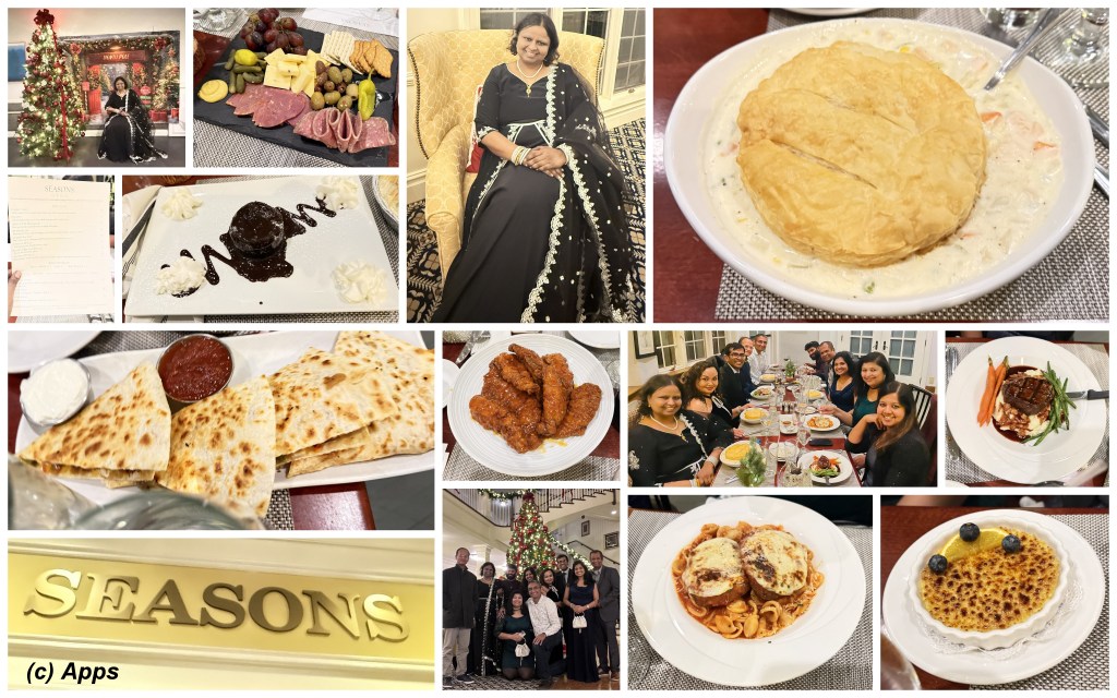 For one of our friend’s wedding anniversary, we went to dinner at Seasons Restaurant and Tap Room in Avon, CT. It was inside a hotel, so I wasn’t sure about the décor and food. Surprisingly the food was really good and so also the décor. I felt a bit expensive, but the food, drink and service is really good. It had beautiful décor, even the bathrooms looked beautiful. And this being around Christmas there was extra special décor everywhere.
